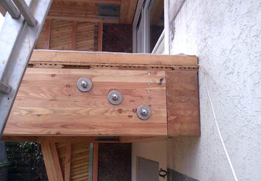 Herstellung eines 2stöckigen Vollholz-Balkons aus Lärche. Hierzu wurden die vorhandenen Balkone abgebaut und die neue Konstruktion ohne Wärmebrücke zum Gebäude erstellt. Den Bedürfnissen entsprechend wurde der Balkon im Obergeschoss für Rollstühle zugänglich gemacht sowie der Hauskatze ein Außenzugang gebaut.